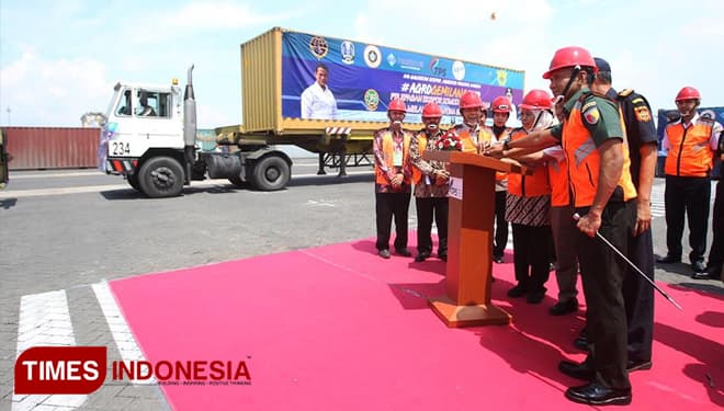 TIMES Makassar/Gubernur Jawa Timur. Dra. Hj. Khofifah Indar Parawansa saat melepas ekspor komoditi pertanian di Terminal PetikEmas Surabaya (TPS). Kamis (21/3/2019). (FOTO: TIM Media For TIMES Indonesia)