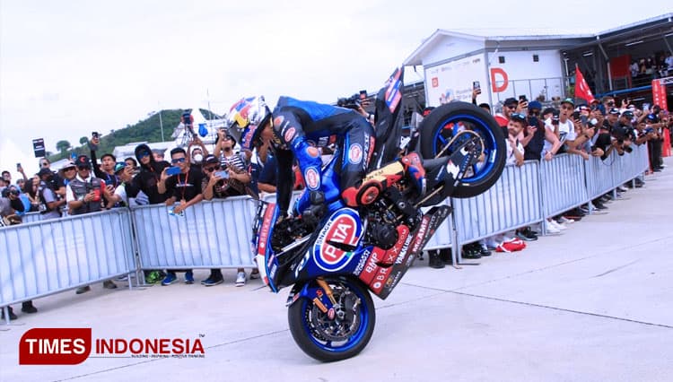 TIMES Makassar/Pembalap PATA Yamaha Brixx Toprak Razgatlioglu melakukan atraksi stopie ban depan usai memenangi race 1 WSBK Mandalika 2022, Sabtu (12/11/2022). (FOTO: Tria Adha/TIMES Indonesia).