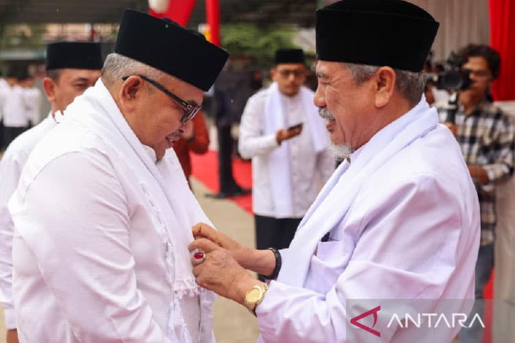 TIMES Makassar/Pimpinan pesantren Insafuddin Banda Aceh memberikan kain kepada Sekda Aceh Bustami Hamzah usai peringati Hari Santri, di Banda Aceh, Selasa (24/10/2023). (FOTO: ANTARA/HO/Humas Pemprov Aceh)