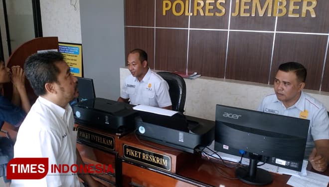 TIMES Makassar/Wakil Ketua Bidang Litbang dan IT DPD Partai Perindo Kebupaten Jember, Ahmad One Prastiono saat melaporkan Ketua DPD Partai Perindo Kabupaten Jember Hanung Prijobodo ke Polres Jember, Senin (6/5/2019). (FOTO: Dody Bayu/TIMES Indonesia)
